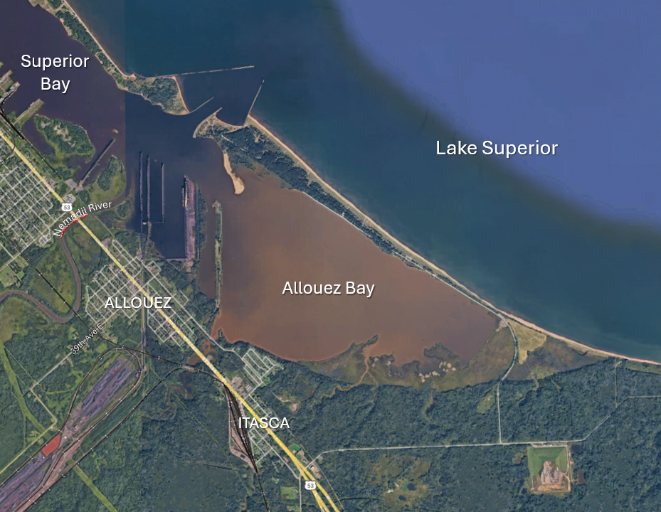 Today the strip of narrow land, Gibiskising Minis (land bridge) in Ojibwemowin, marks the boundary between the river and the lake. Allouez Bay is located at the southeastern corner of the estuary at the mouth of the sediment-rich Nemadji River, and adjacent to the Superior Entry, the natural opening between the river and the lake.
